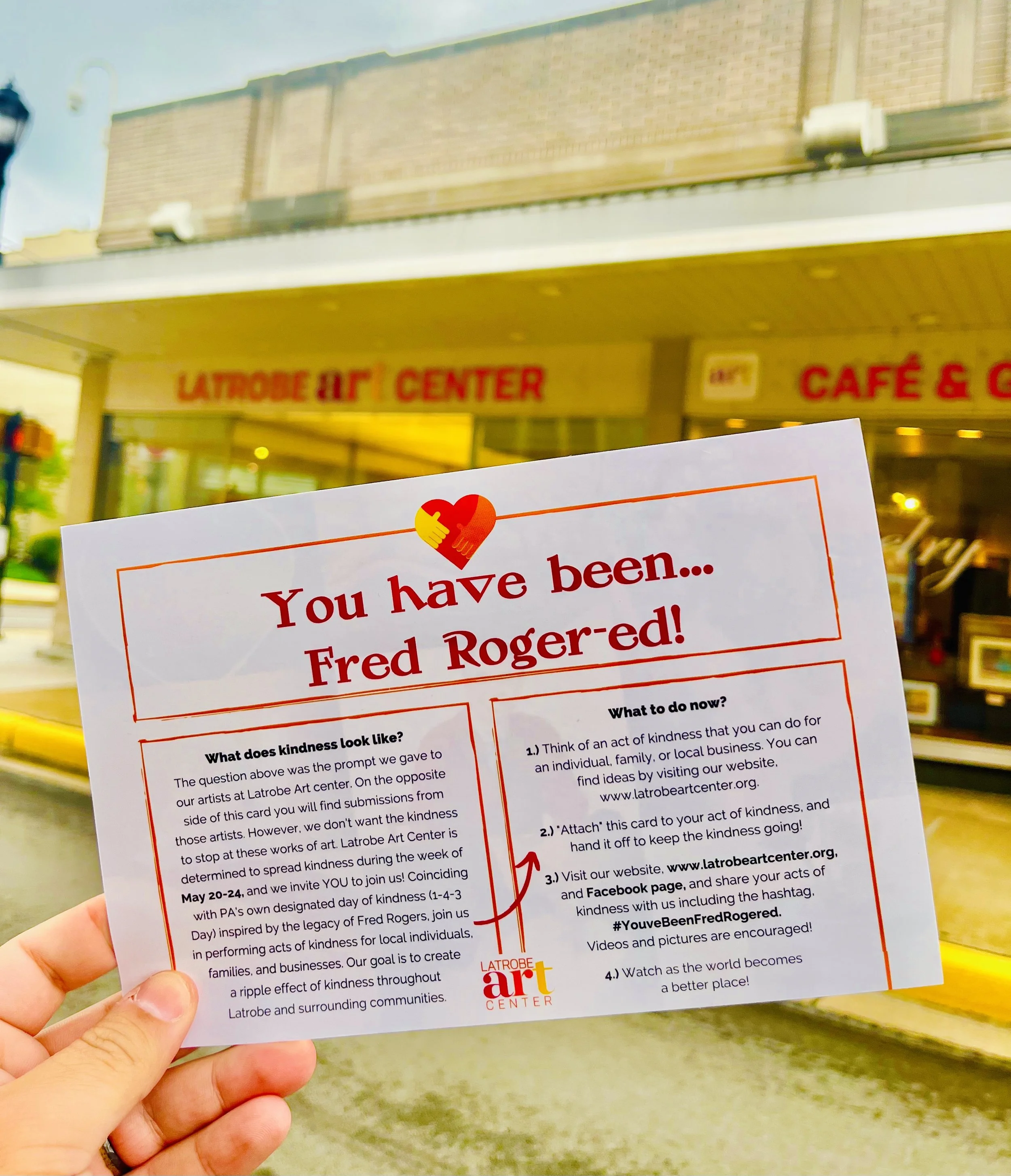 Latrobe Art Center is seeking to spread intentional acts of kindness throughout the community coinciding with Pennsylvania's own designated day of kindness (1-4-3 Day) inspired by the life and legacy of Fred Rogers. During the week-long event, participating individuals and organizations are instructed to use the art center’s specially designed "You've Been Fred Roger-ed" cards while conducting acts of kindness to capture the moment and lead others to continue spreading kindness. One side of each card contains information about the event and instructs recipients on what to do next. The opposite side of each card features works of art by some of the center’s member artists who submitted pieces responding to the prompt “What does kindness look like?”. The works by each artist are examples and visual representations of kindness created in the hope of further inspiring the actions of those who choose to participate throughout the week.