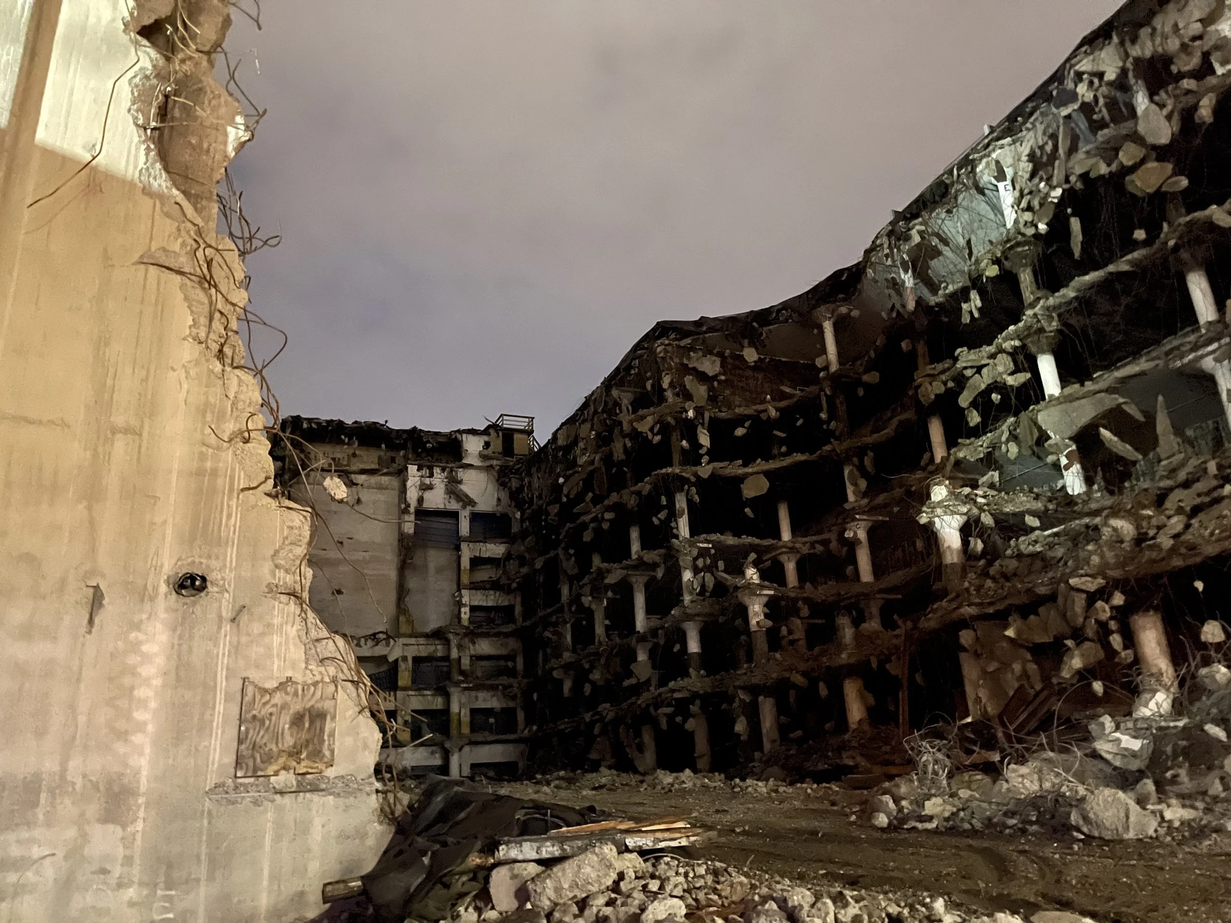 Exactly one month before attending Dr. David Rotenstein’s lecture I was standing on Lucky’s back deck gawking at the half standing remains of the cold storage facility. Nothing stands between deck of the fun bar, known for its live male dancers, and the carnage of a construction site that looks like something you’d see in a war zone, like in Ukraine, where a building had met the impact of a stray missile. I walked out onto that deck after two intense games of chess inside the bar (I won one match and was crushed in the second). The demolition of the cold storage facility was more closely resembled the chess match inside than the war in Ukraine.
