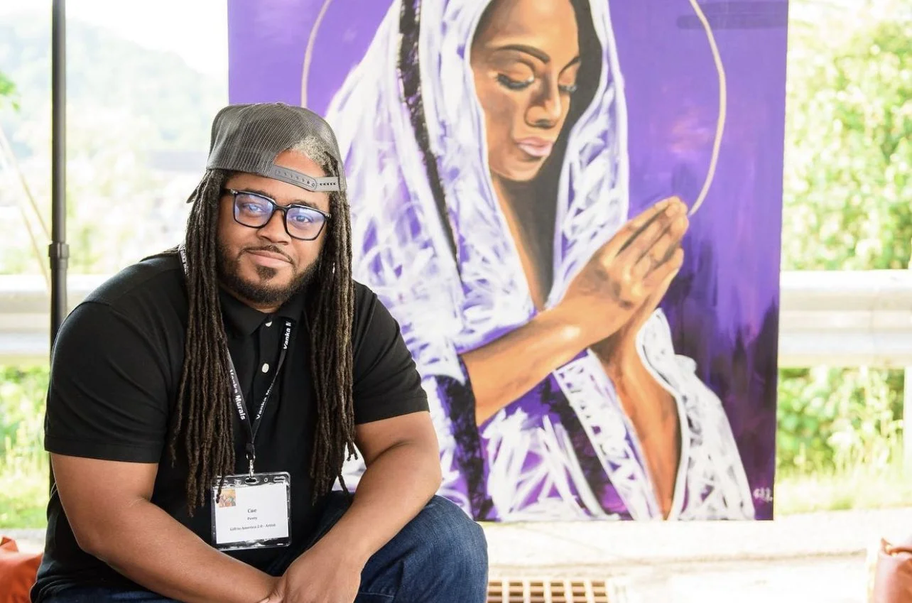 Cue Perry was one of those artists. He and the other three were at the event to greet attendees. Before responding to an open artist call for the project, Mr. Perry didn’t know about Vanka or his murals. Perry told PGH Museums in a statement that he felt the murals were breath taking after seeing them for the first time, “in particular the injustice painting was bold and striking.” Perry’s project focused on motherhood and justice. He came to this decision after speaking with students at Amachi Pittsburgh, a nonprofit he partnered with.