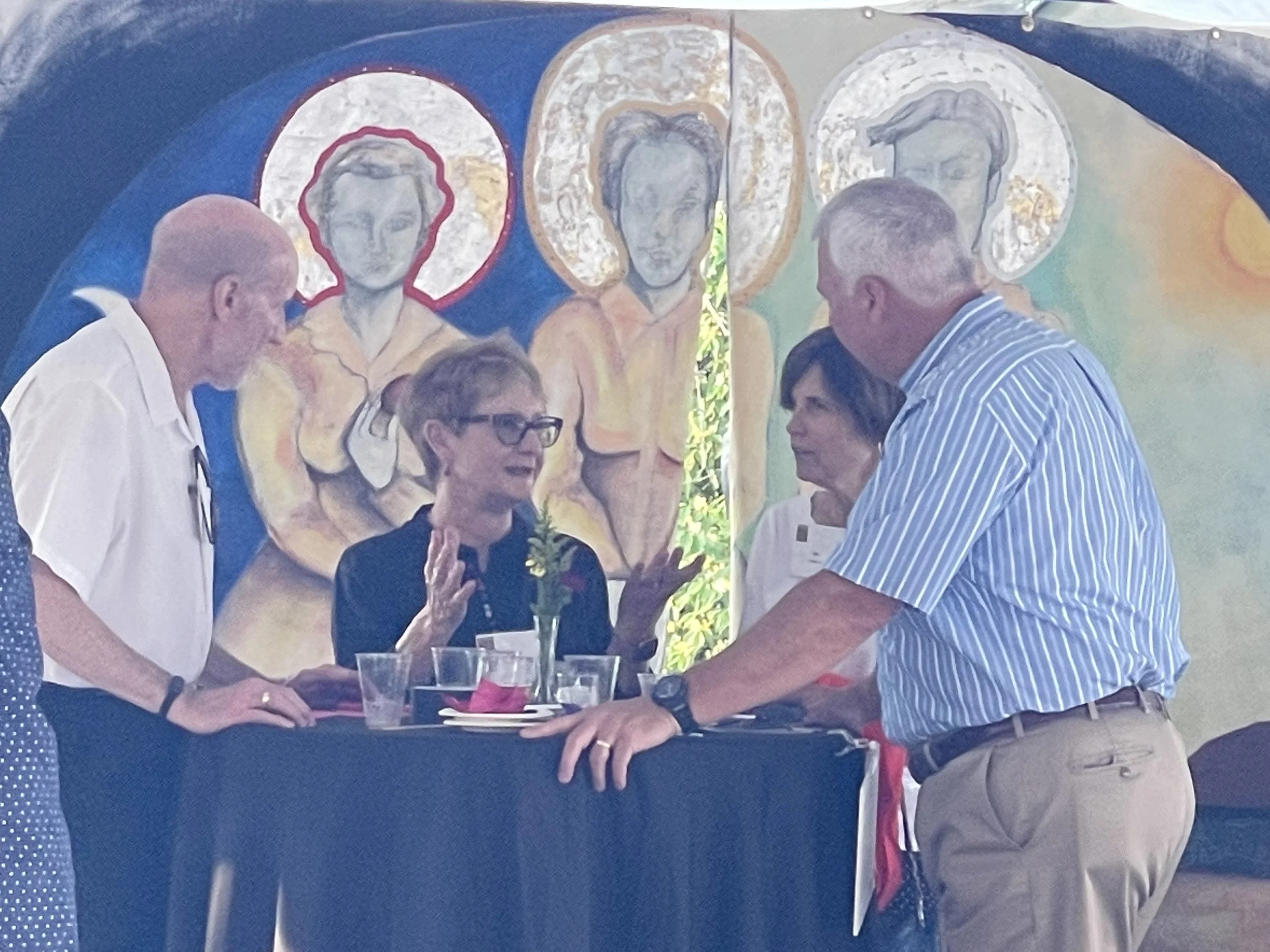 To keep people engaged and inspired during the last two years the society took Vanka to the people with high tech virtual reality and new art commissions inspired by Vanka’s work. Jim Ledoux, the man responsible for the VR, was at the party in a tent outside the church, the VR on hand. I decided to try it out. Goggles on, clicker in hand, I found myself in the church’s sanctuary…floating. Yes, I said floating, high above the church pews with the opportunity to see the murals from a different perspective than when observing them in person.