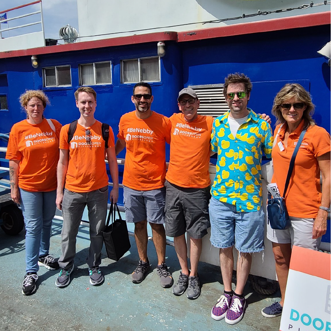 Doors Open staff and volunteers meet Brian (second from right) including Bonnie Baxter (right), Christine Montgomery (left), and Todd Wilson (second from left)