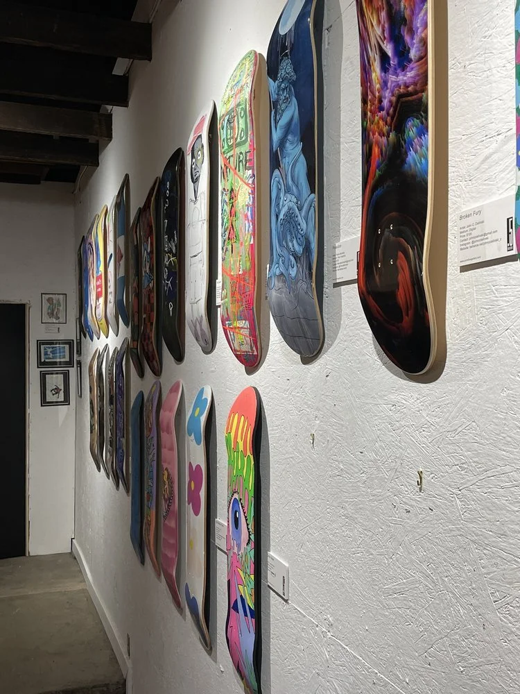 Last Saturday .5 featured skate decks from a variety of artists. For the noobs of us out there, like me, a skate deck is the piece of the skateboard you stand.. Skate deck shows are a tradition at the Etna gallery which is a cool slice of culture snuggled between two store fronts, long and rectangular, giving you a view of everything inside while passing by along the street. Allegedly, before it was a gallery, it was a baseball card shop, a shoe shine spot, and before that, an alleyway.