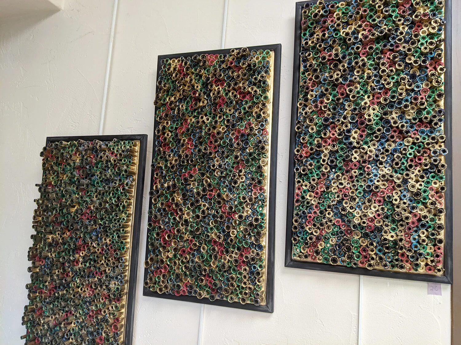Her art can be described as abstract, collage paintings using wood, metal, wire, beads, yarn, and recycled items. Her creative process, though, is not always a straightforward path. “When I begin a piece of work, I have an idea of what I want to create, but then the piece of art I am creating has a mind of its own and goes off in a totally different direction then what I was planning to do in the first place,” Chmel Brown explained. “I have no idea where this journey is taking me, but I do know when it is complete. As I finish a piece of work, I feel a void within me filled. I feel a sense of peace and accomplishment, a feeling of growth and completeness.”