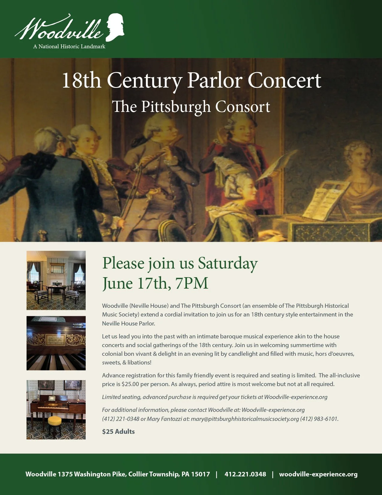 Woodville (Neville House) and The Pittsburgh Consort (an ensemble of The Pittsburgh Historical Music Society) extend a cordial invitation to join us for an 18th century style entertainment in the Neville House Parlor.
