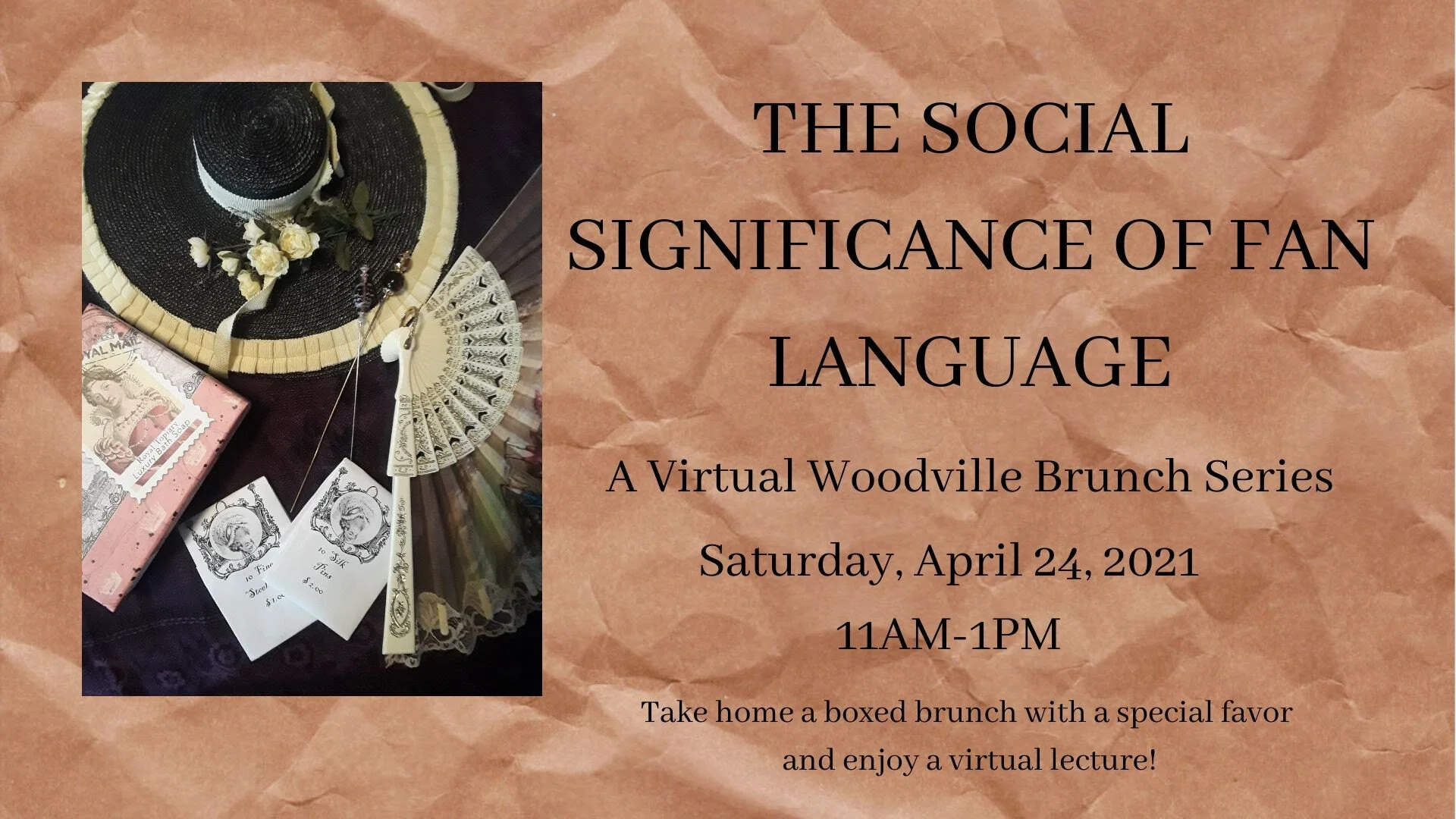 Fan language spans many eras and cultures. In our first lecture of the virtual brunch series, we will discuss some of these cultures and the integral role that fan language played in each one. There may even be a short lesson in how to properly use your fan!