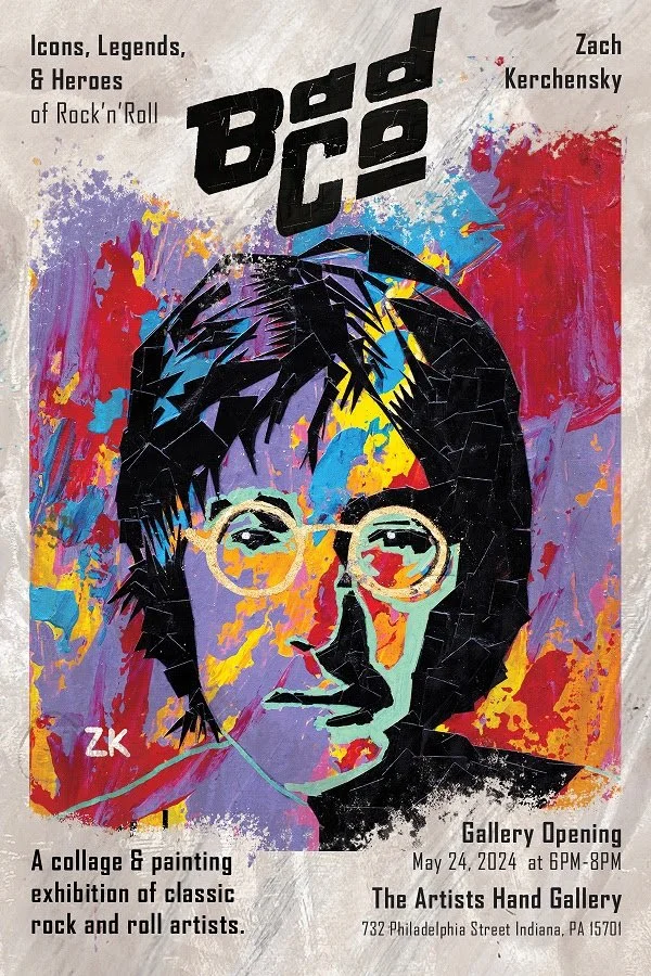 The Artists Hand presents a special exhibition during Indiana’s traditional welcome to summer. Iconic collaged paintings of classic rock and roll artists. What would Memorial Day in Downtown Indiana be without the Westsylvania Jazz and Blues Festival? Each year our gallery has presented an exhibition in rhythm with the seasonal WJ&BF kick-off. This year the local artist and IUP art education grad Zach Kerchensky has created a series of rock'n'roll icons. They resonate with spectacular color and texture. You can feel their landmark recordings in the very fibers of each panel. Don’t take my word for it. Come let your heart listen while you view the hall. Our artist's reception begins at 6pm on Friday, May 24th. Then head down the street to the Indiana Theater. This year’s festival headliner is Benny Benak III performing there at 7:30.