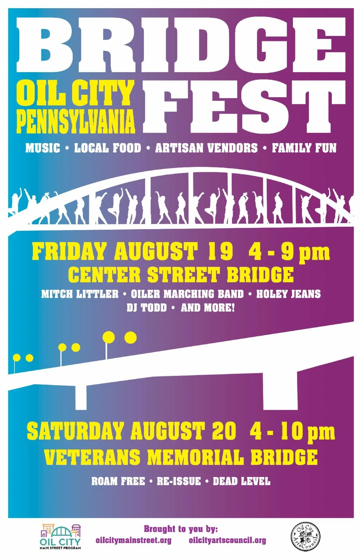 Get ready for BridgeFest 2022! Two evenings of music, local food, artisan vendors and family fun … Come celebrate and enjoy spectacular views of Oil Creek, the Allegheny River and surrounding Oil City scenery!