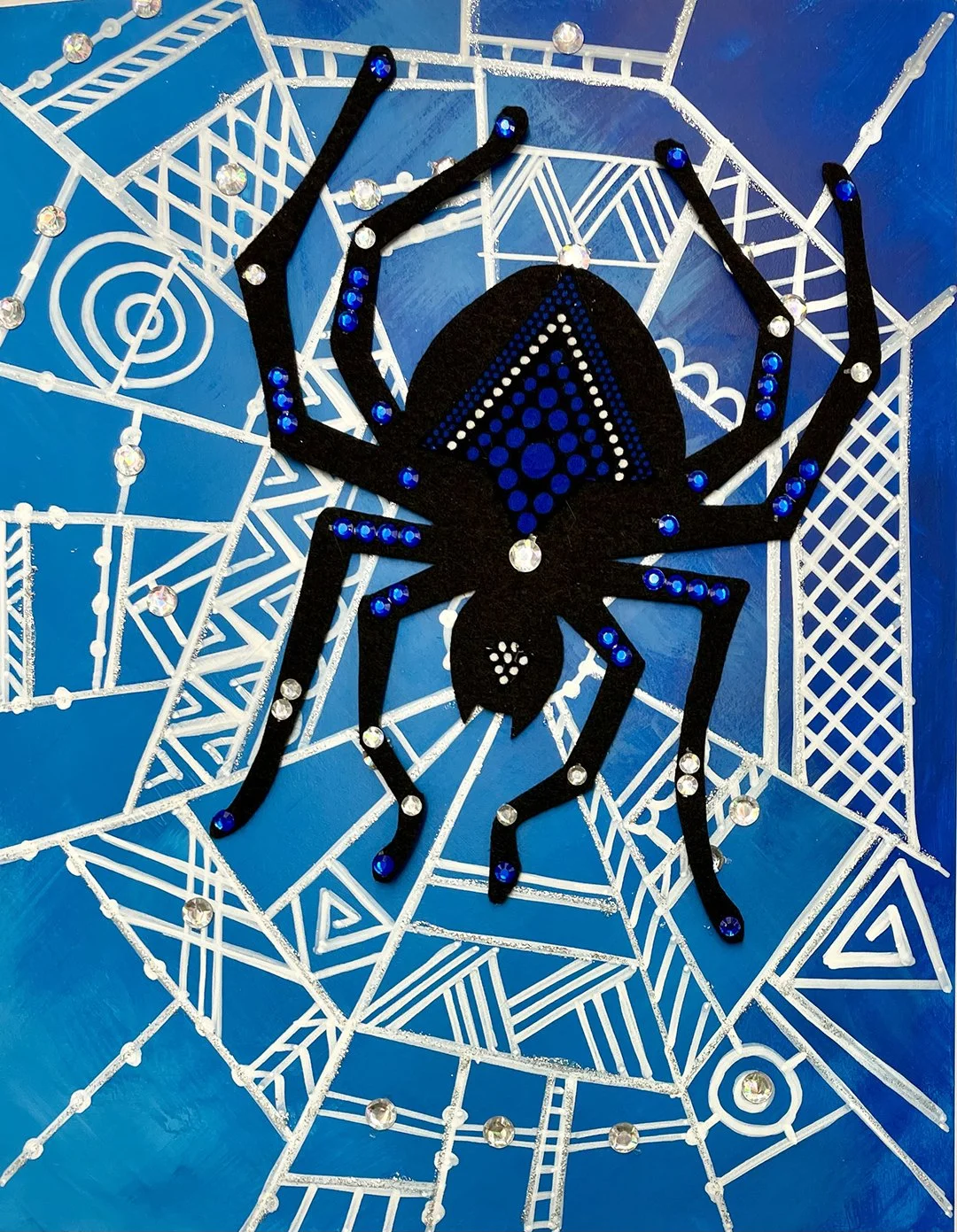 Explore mixed media collage! Use color and pattern to make a web design with paint and sequins. Felt and fabric will complete the project with a sparkly spider.