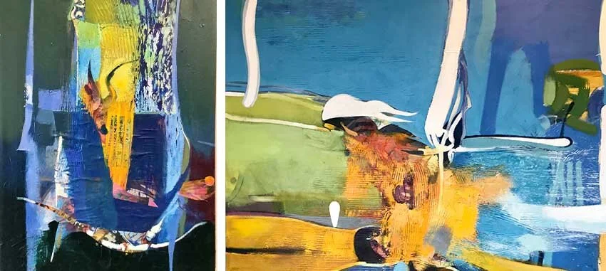 (L): Post Moderno, acrylic and collage on canvas, 34 x 22 (R): Landfall (detail), acrylic on canvas, 72 x 72