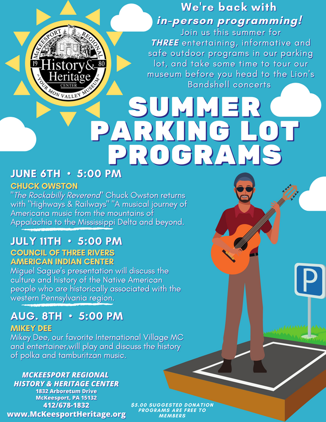 Chuck Owston performs at McKeesport Regional History and Heritage Center Sunday, June 6, 2021 5:00 PM 6:00 PM McKeesport Regional History and Heritage Center (map) Google Calendar ICS