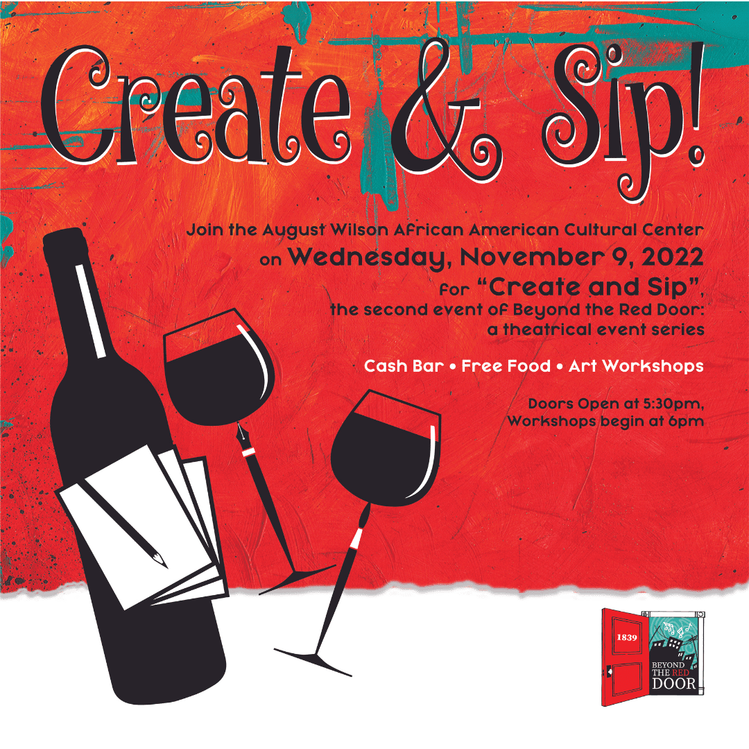 Join the August Wilson African American Cultural Center on Wednesday, November 9, 2022 for “Create and Sip,” the second event of Beyond the Red Door: a theatrical event series. Grab a glass of wine, beer, or soda and dive into an evening of arts workshops rooted in August Wilson’s creative process.