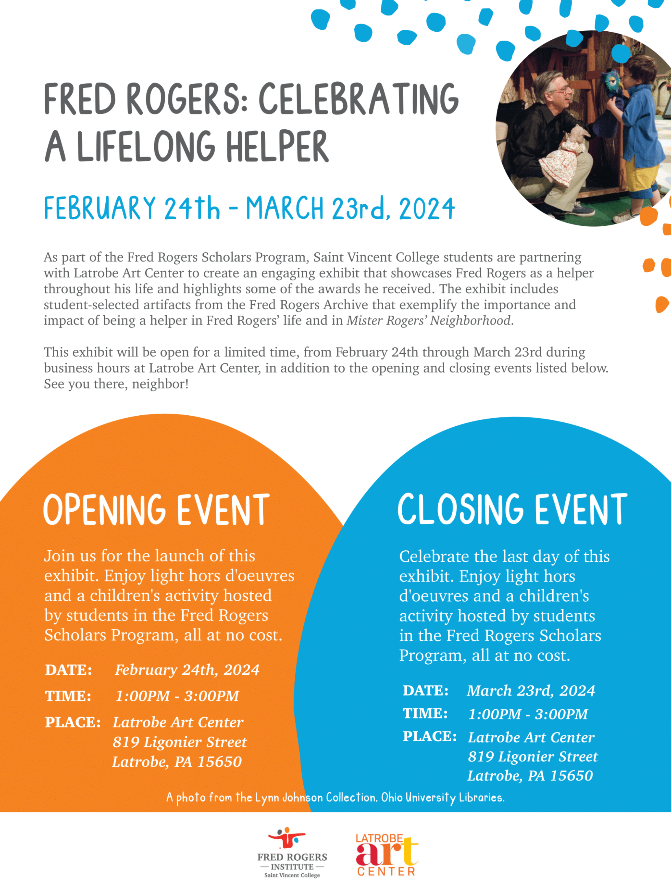 The Closing Event will run from 1:00-3:00 p.m. on Saturday, March 23rd and will feature artifacts on view from the Fred Rogers Archives, a children’s activity, and light hor d’0euvres by Ricolita’s Cafe.