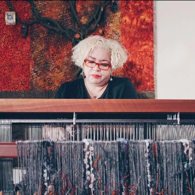Kemp’s award-winning textiles have become iconic in Pittsburgh’s fiber arts community, from woven clothing to greeting cards, sculptural dolls, and home goods. She incorporates on and off-loom weaving, handmade felt, traditional and Japanese Shibori dying techniques, and beading to enhance her work.