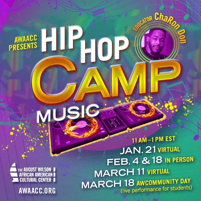 Hip-Hop Music Camp will include 4 sessions that will focus on the history and evolution of hip-hop, lyrical content and artistic responsibility, and discover the connection between August Wilson and hip-hop music. Music Camp will be taught by Educator, ChaRon Don, a music pioneer from Pittsburgh, Pennsylvania. Over the course of the camp, students will learn the importance of hip-hop and the role of rap music, how to create their own song including verses, chorus, and bridge, stage performance, and will prepare their own song that will be performed at our March 18, 2023 Community Day. This camp is suitable for high school students, ages 14-18 years of age.