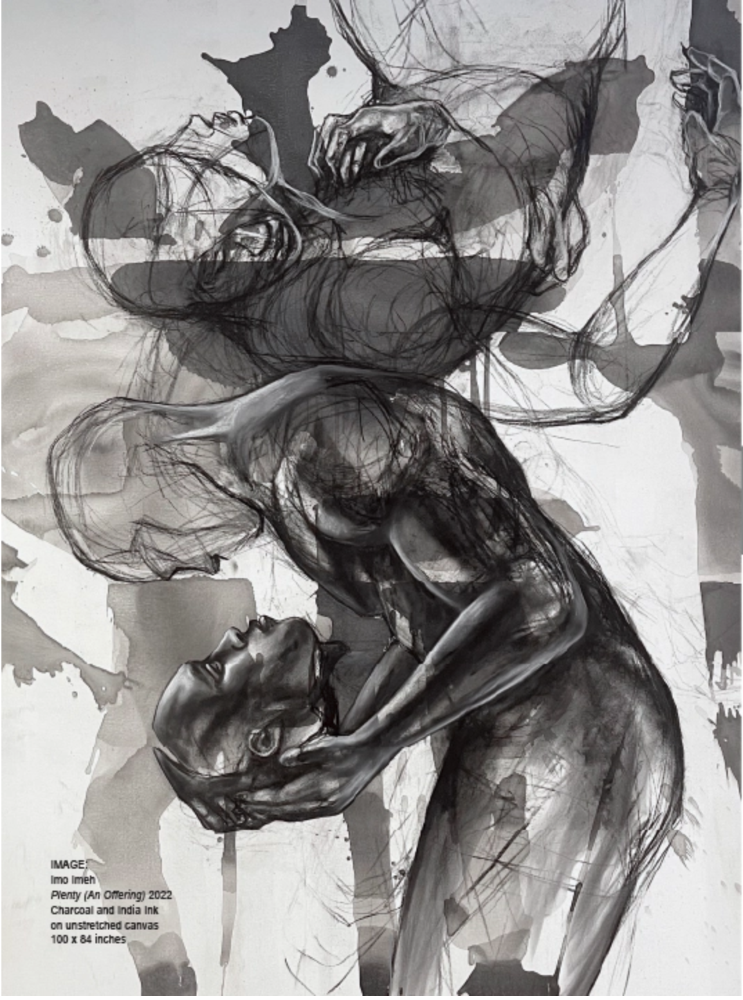 With the Benediction series, Imeh tells the story of a group of angels that have been cast down to earth and bound to the skins of Black boys and men. The angels’ task is to serve as witnesses to the traumas and triumphs that they experience through their “hosts.” A “benediction” is a short invocation, a prayer for help or guidance, usually given at the end of a service of worship. But a benediction is also often a declaration that comes at the commencement of something wonderful. In Imeh’s work, “benediction” speaks to both the death and resurrection of Black men.
