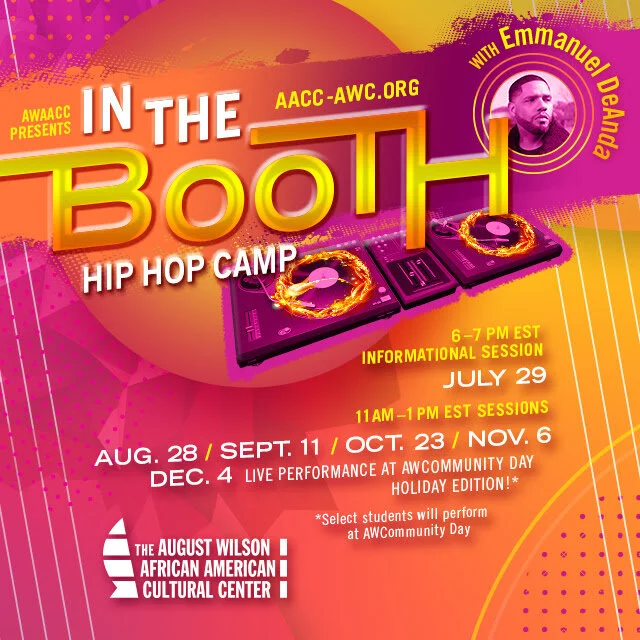 In the Booth is a four-part session that will focus on the history and evolution of hip-hop, lyrical content and artistic responsibility, and discover the connection between August Wilson and hip-hop music. In the Booth will be taught by Educator, Emmanuel DeAnda, a music pioneer from Pittsburgh, Pennsylvania. Over the course of the camp, students will develop their own song by writing lyrics that include a verse, chorus, and bridge and will select a beat produced by our Educator to create a final piece that will be performed and showcased at our December 4th Holiday Community Day. This camp is suitable for high school students, ages 14-18 years of age.