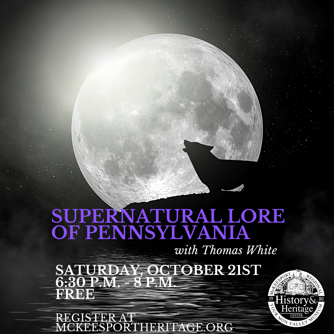 Love tales of werewolves and other supernatural stories? Then you won’t want to miss our program “Supernatural Lore of PA” featuring Thomas White, local author and speaker on Saturday, October 21st at 6:30 p.m. Registration is requested and can be completed using the form below. Light refreshments will be provided.
