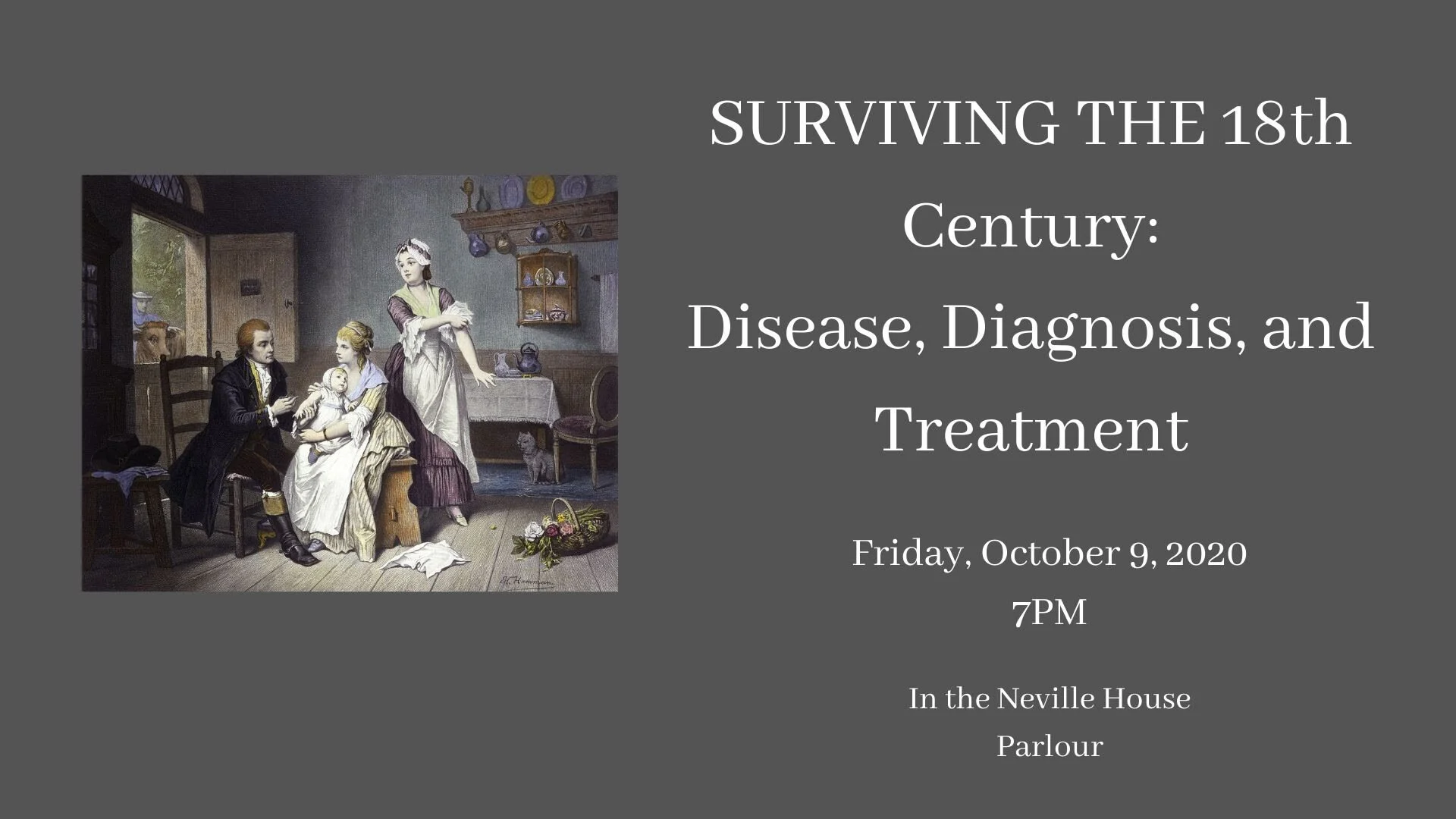 On October 9, local historian and author, Jonathan Klemens will take us through the treatments and methods of medicine of the 18th century. His talk will cover medical theory and virtually all common therapeutic modalities for 18th C American colony medicine. There will also be a display for those in attendance to peruse.