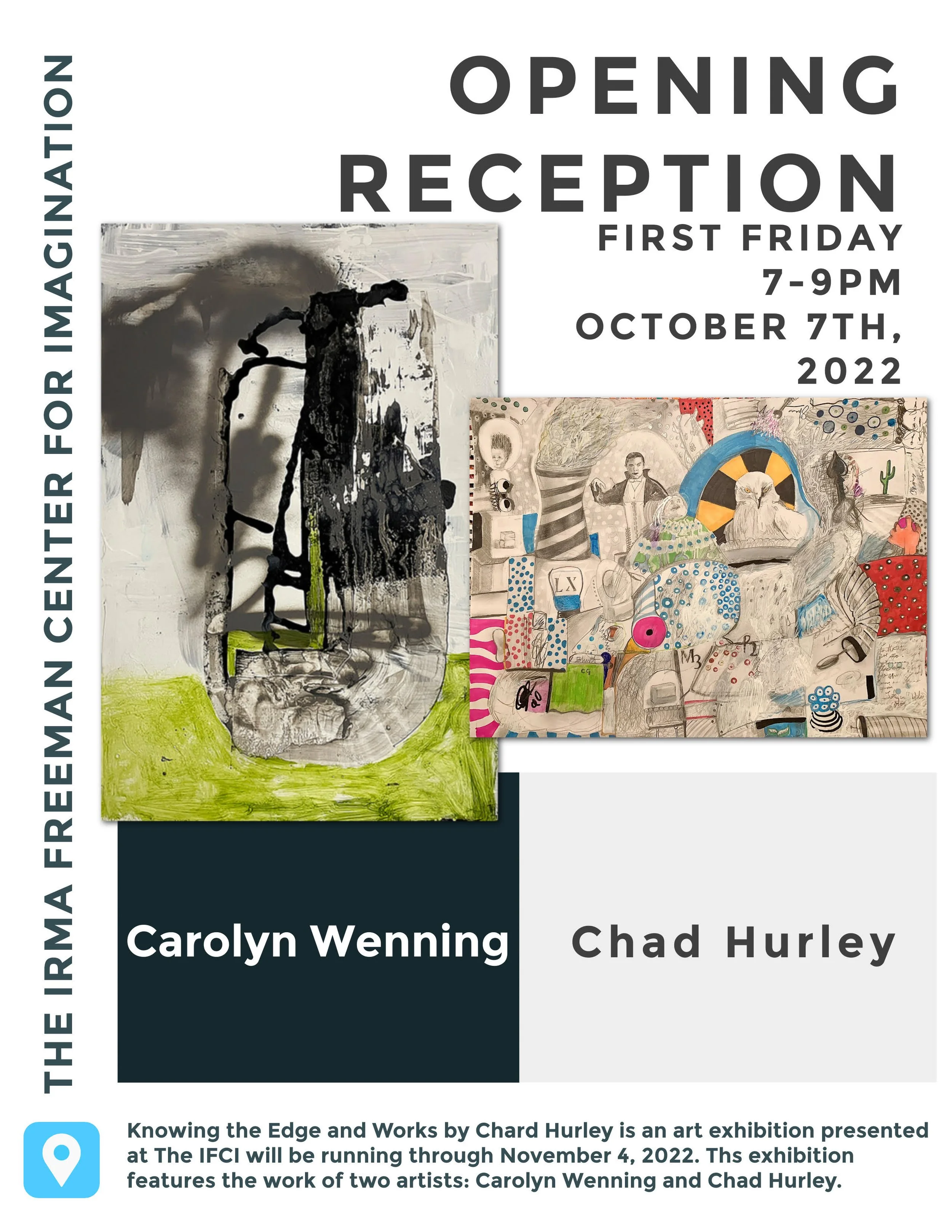 Knowing the Edge and Works by Chad Hurley is an art exhibition presented at the Irma Freeman Center for Imagination opening Friday, October 7th and running through November 4, 2022. The IFCI exhibition features the work of two artists: Carolyn Wenning and Chad Hurley.