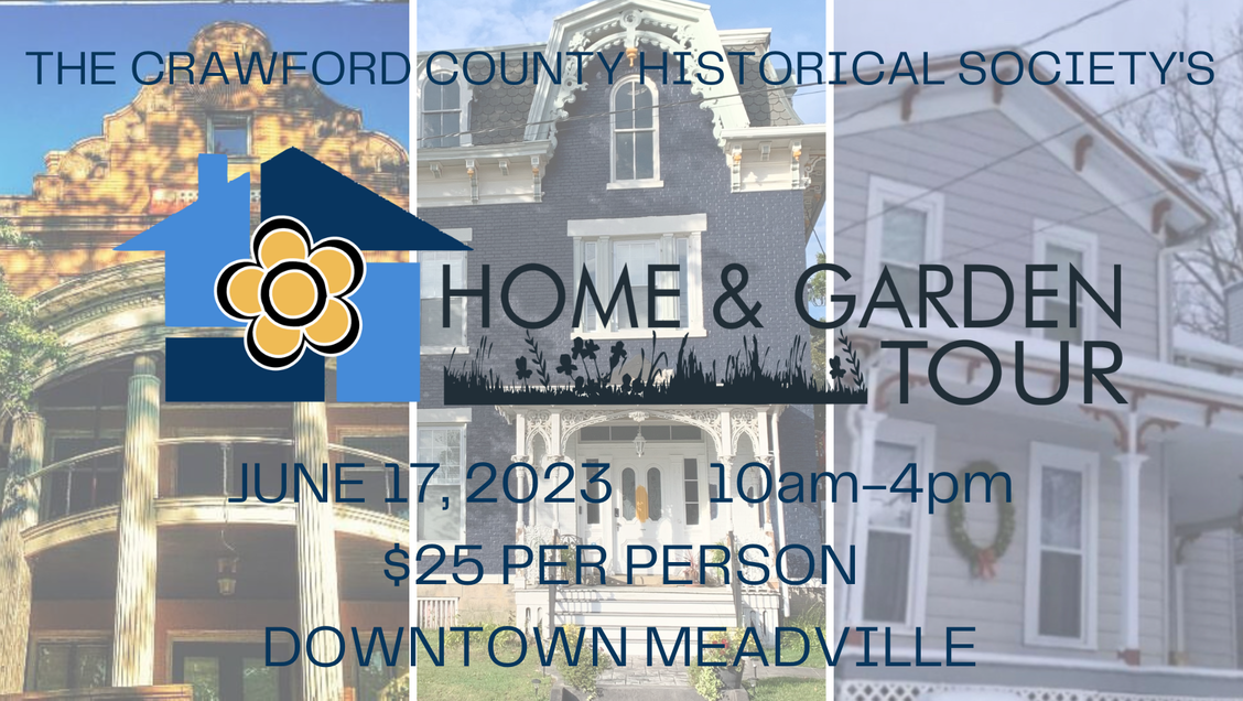The Crawford County Historical Society is excited to present Meadville's Historic Home and Garden tour on June 17th from 10am through 4pm. Sign In/Registration will take place at the Society's headquarters at the James and Elizabeth Tarr Mansion at 869 Diamond Park. Participants will receive an arm band, event shirt, and program booklet featuring photographs, history, and map to get them to over a dozen historic homes, gardens, commercial buildings, churches, and Allegheny College's recently restored Bentley Hall.