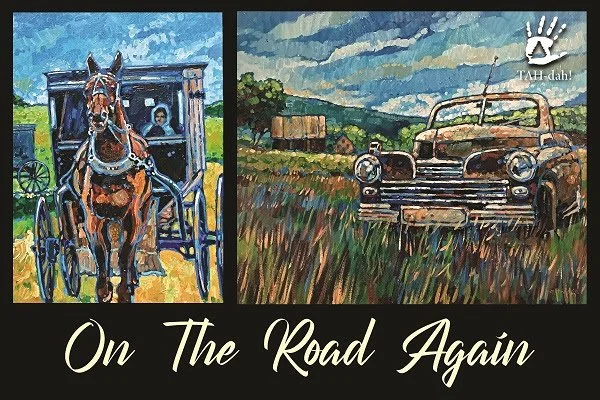 For me, “On The Road Again” is a luminous meditation on the turn of time toward its next season. I hear the rustle of leaves in an autumn breeze at sunset, and the clopping of hooves pulling a buggy traversing gravel veins. I smell the damp must of fallen leaves. The blue jay in a nearby tree cries out “thief! thief!” and I wonder what’s been stolen. I guess I’ve just taken my time. What will you see when you visit The Artists Hand? These paintings await your imagination.