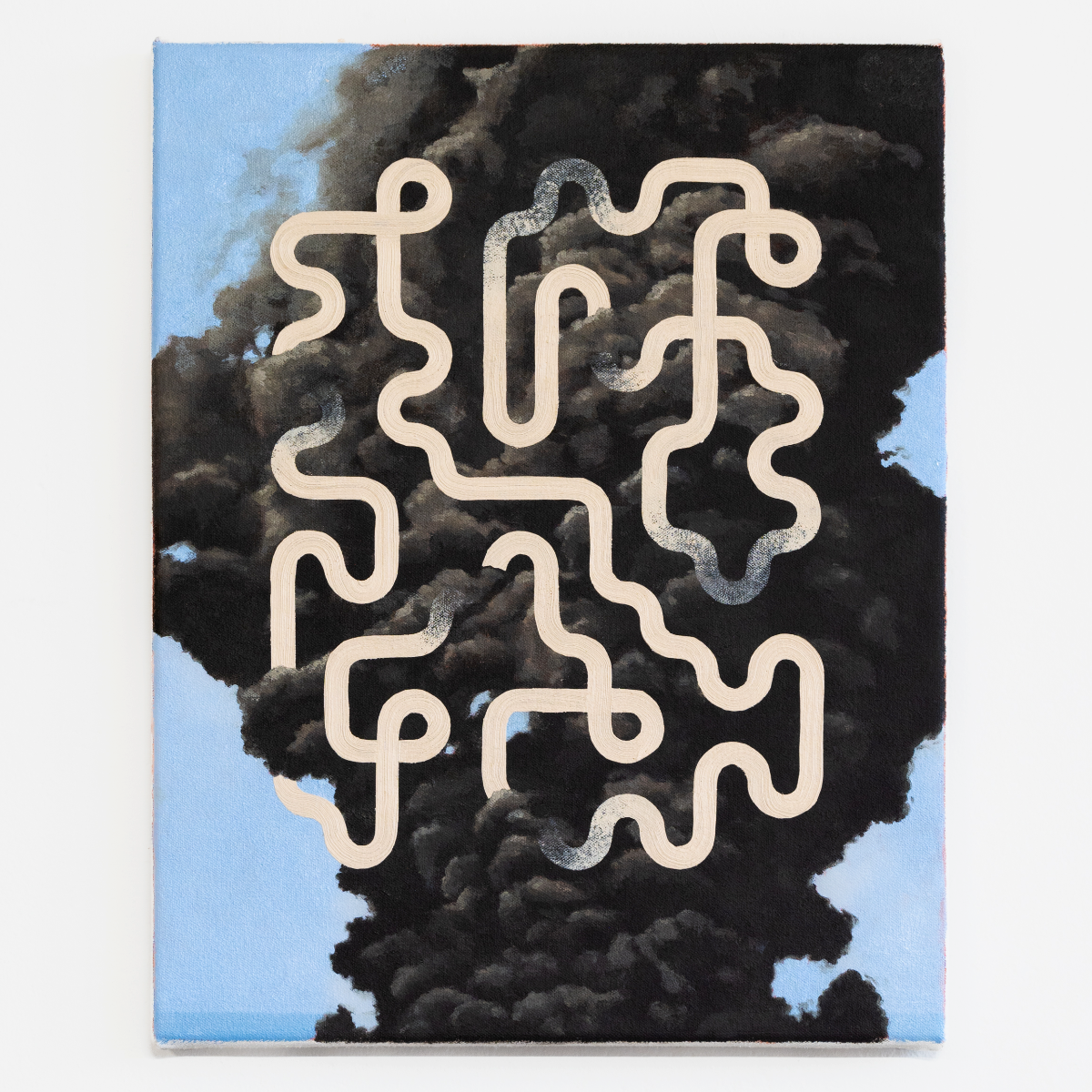 In Spontaneous Horizon, Sanders presents eleven new paintings where the abstract backgrounds of his previous works coalesce into more recognizable imagery, such as trees, a shoe, smokestacks, and a rocket launch. Sanders turns away from pure abstraction to reflect on humanity from a self-referential distance. Instead, Sanders’ new body of work engages directly with ideas of human destruction, intervention, and exploration, all while revealing a certain beauty in the excesses of man. Furthermore, the meandering lines—which either sit firmly on top like in Confluence or are woven into the imagery like in Horizon 1—are a felt procedure. The intuitive line work suggests an attempt to control the uncontrollable or to reduce destruction to a simpler, knowable form.