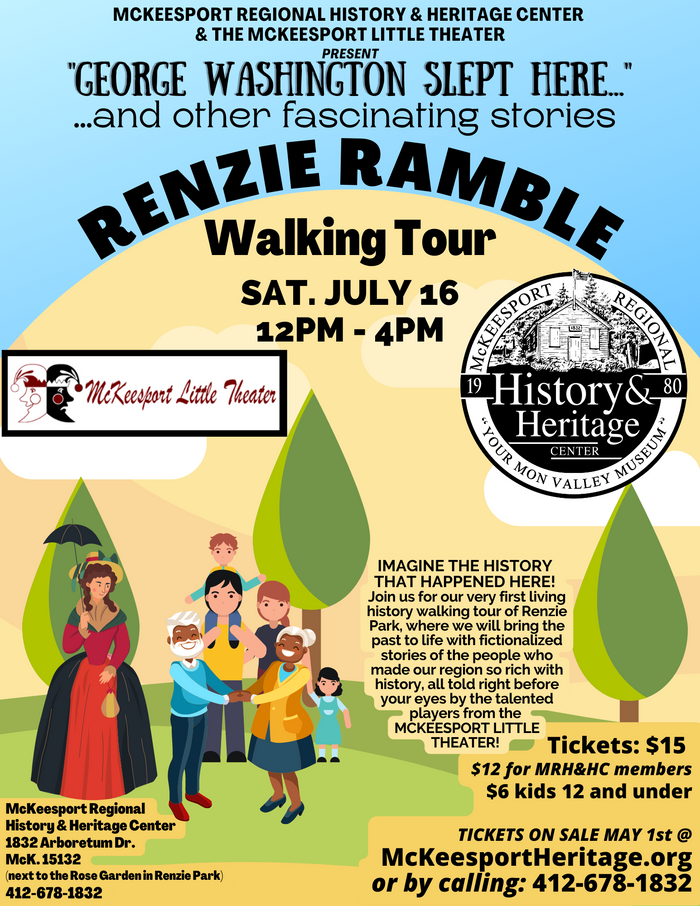 Imagine the history that happened here! Join us for a living history walking tour of Renzie Park, where we will bring the past to life with fictionalized stories of the people who made our region so rich with history - all told right before your eyes by the talented players from the McKeesport Little Theater!