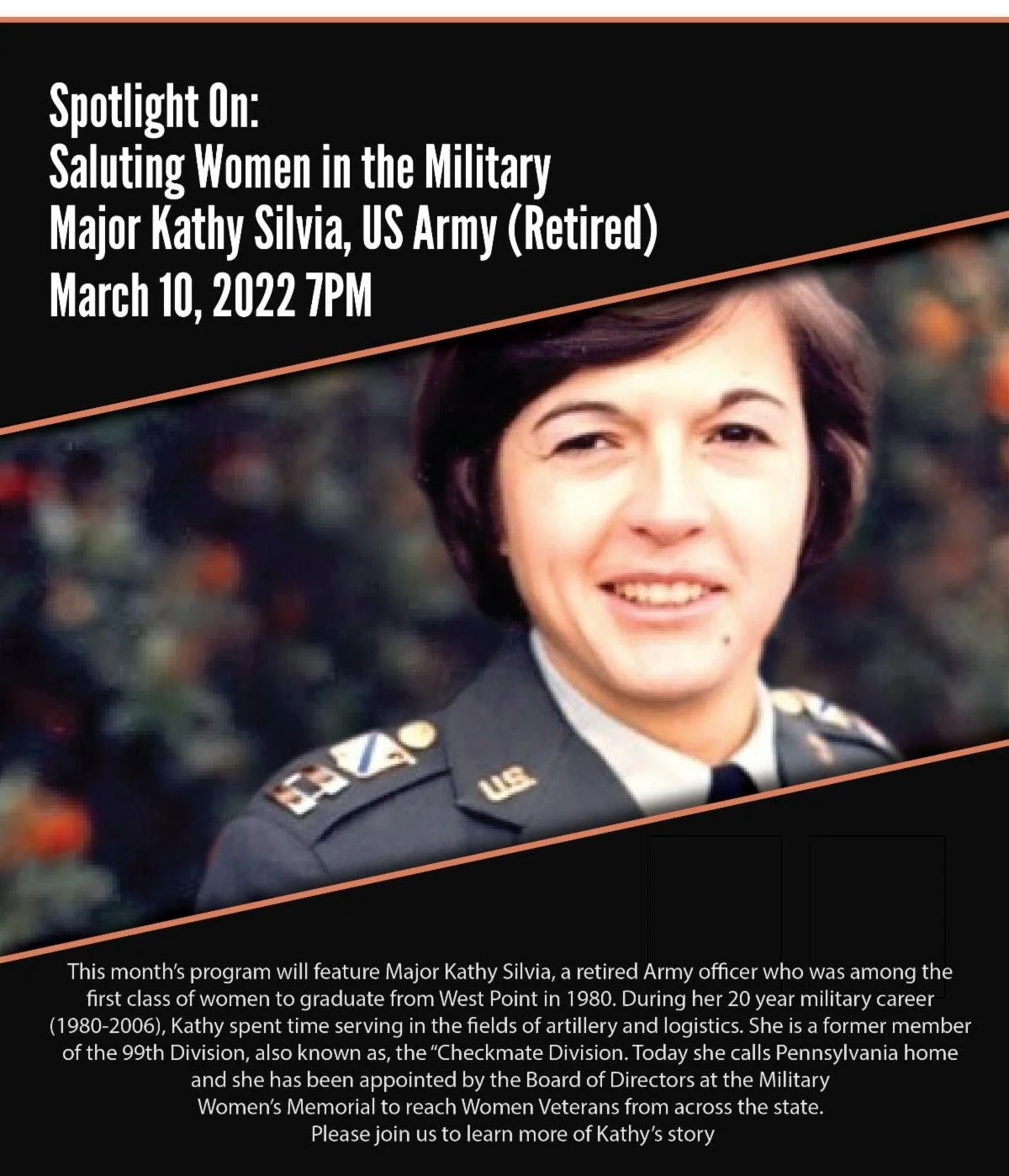 This month’s program will feature Major Kathy Silvia, a retired Army officer who was among the first class of women to graduate from West Point in 1980. During her 20 year military career (1980-2006), Kathy spent time serving in the fields of artillery and logistics. She is a former member of the 99th Division, also known as, the “Checkmate Division”. Today she calls Pennsylvania home and she has been appointed by the Board of Directors at the Military Women’s Memorial to reach Women Veterans from across the state. Please join us to learn more of Kathy’s story.