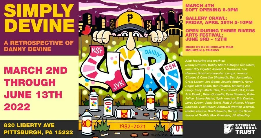 Simply Devine: A Retrospective of Danny Devine (1982-2021) showcases thought-provoking, uplifting, joyful, and playful works created by the late Pittsburgh native. Danny was a respected graffiti writer, muralist, photographer, printmaker, painter, mentor, and friend to many. The immersive exhibition embodies Danny’s dedication to creativity and his prolific artistic output - taking viewers on a visual journey exploring his complexity as an artist.