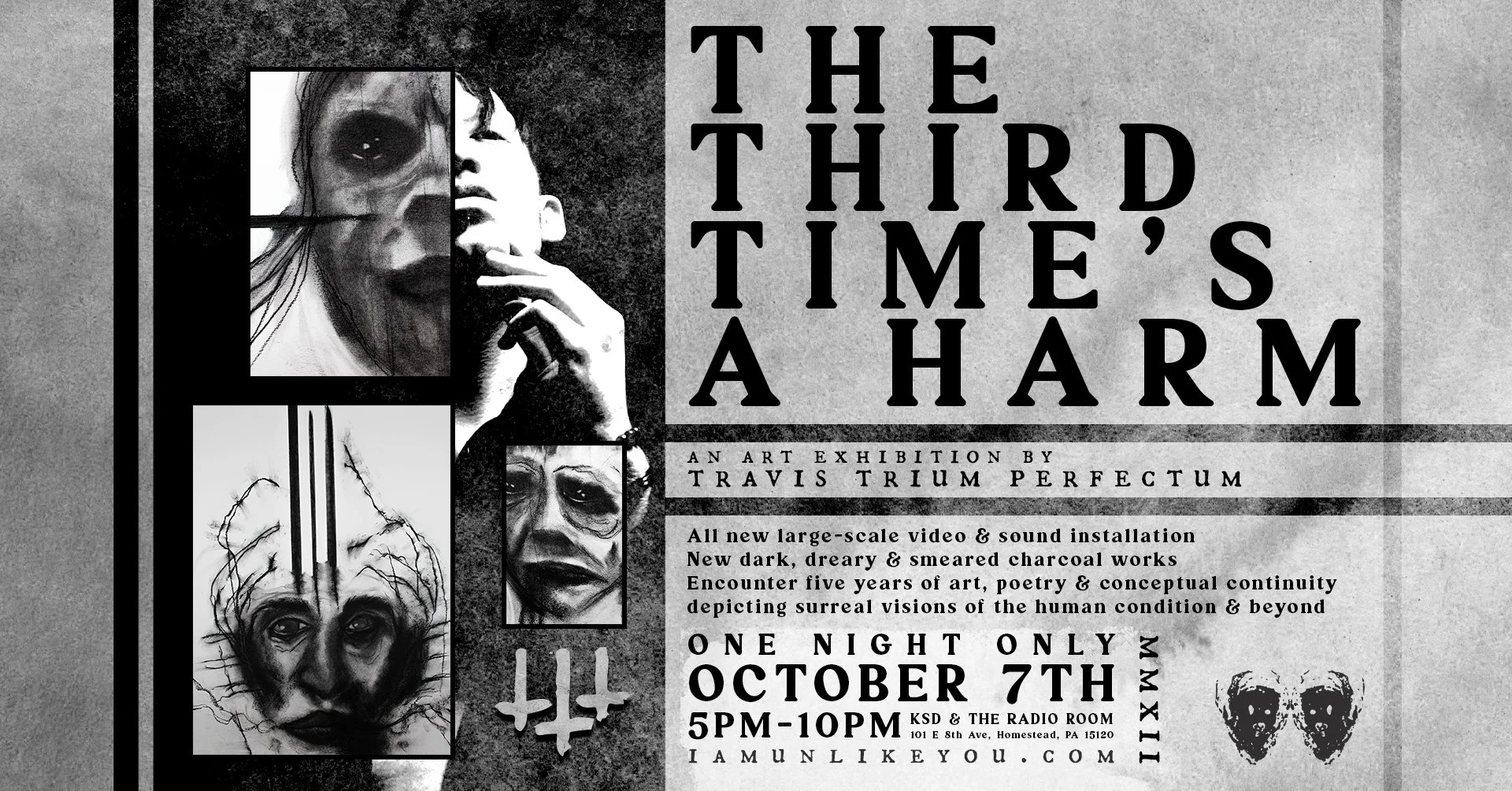 Travis Trium Perfectum brings his medium blurring art experience to KSD & The Radio Room gallery in Homestead, Pennsylvania. The Third Time's a Harm exhibition is centered upon three charcoal pieces that will be brought to life in his all new large-scale video & sound installation. Made up of multiple monitors and the piece being 9 feet wide by over 6 feet tall, this will undoubtedly be a must-see ominous spectacle. New charcoal pieces will also debut and surround the viewer as you encounter five years of art, poetry and conceptual continuity depicting surreal visions of the human condition. (The Third Time's a Harm will be on display starting October 7th for opening night through November 19th's closing ceremony. Video installation only available October 7th and November 19th)
