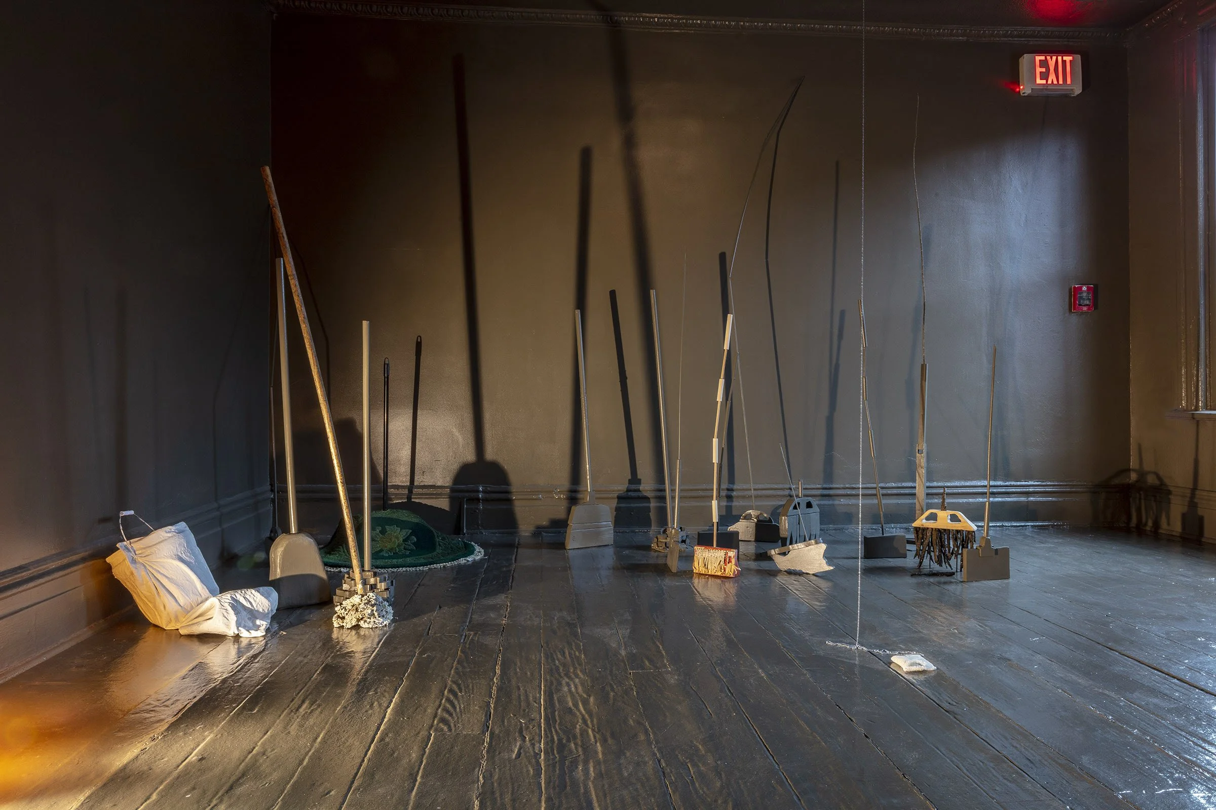 At the Mattress Factory, Rosenberg exhibits the objects that fictional Annette has been making. The objects are hybrids, much like Annette: shredded books or cast crow’s feet become broom bristles, a lamp becomes formless, a pillowcase becomes a bucket, and ceramic spaghetti turns into a mop. These transmutations get at the heart of how we tend to care for objects rather than ourselves or other humans and how this is further complicated when the imaginary becomes material and vice versa.