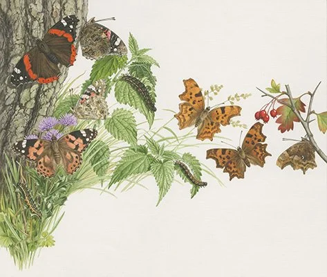 Spread No. 7; Nymphalidae; Vanessa atalanta; Vanessa cardui; Polygona c-album, watercolor on paper by John Wilkinson (1934–), 1975, 32 × 36.5 cm, for his and Michael Tweedie, Collins Handguide to the Butterflies and Moths of Britain and Europe (London, William Collins Sons & Co., Ltd., 1980, pp. 34–35), HI Art accession no. 8560.16, reproduced by permission of the artist.