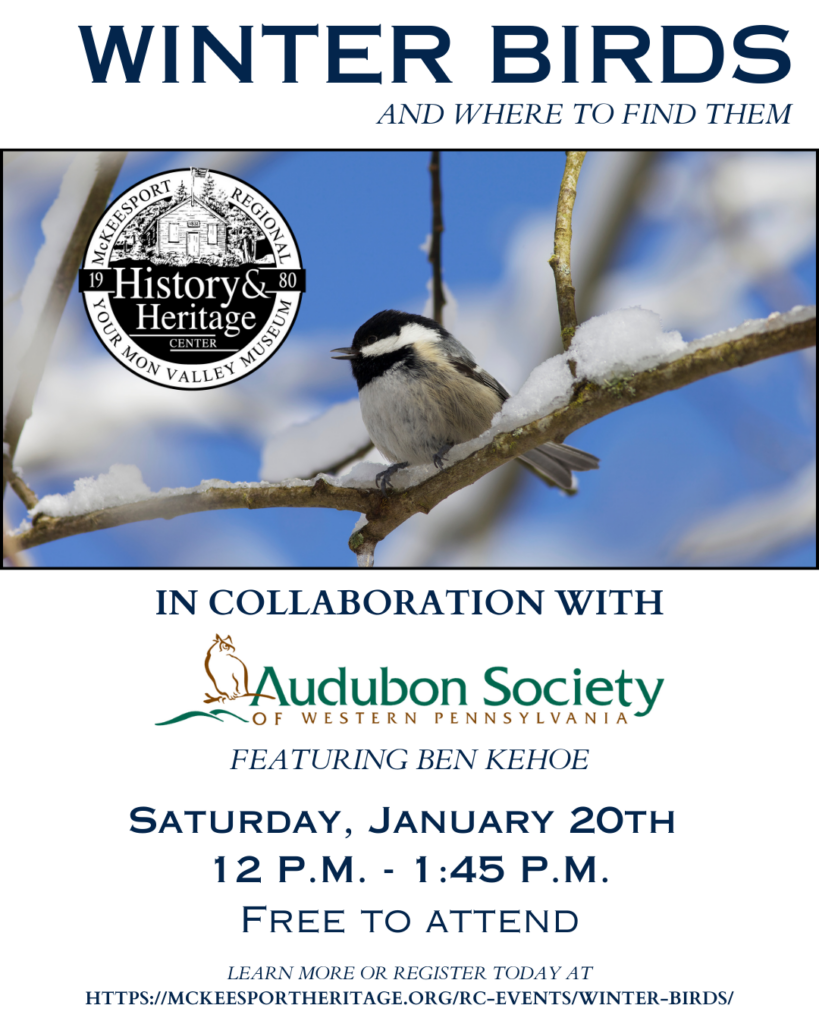 New to birding and don’t know where to start? Long-time nature enthusiast looking to improve your birding skills or learn about the birds in our communities? Then you won’t want to miss our program, led by Ben Kehoe, and in partnership with the Audubon Society of Western Pennsylvania, Winter Birds and Where to Find Them on Saturday, January 20th here at the Heritage Center. This program is free and registration can be completed by filling out the form below.